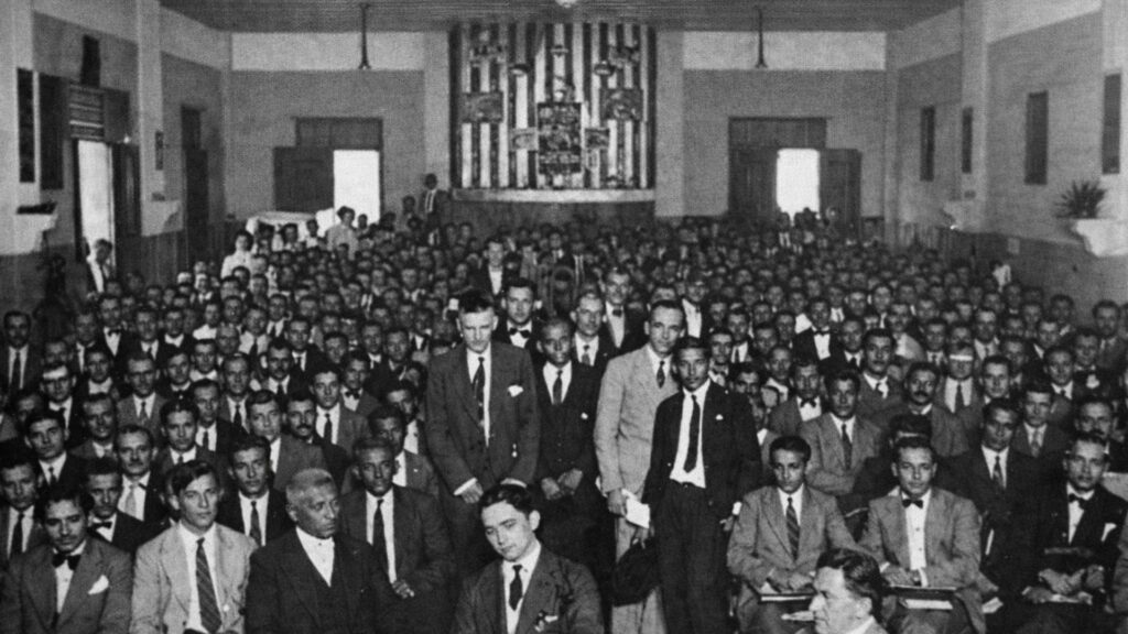 Observa-se, nas imagens, a presença de lideranças destacadas posicionadas nas primeiras fileiras, além de mesas, documentos e um ambiente organizado, sugerindo reuniões deliberativas, congressos ou assembleias gerais. Esses registros fotográficos corroboram a descrição feita por Porfírio Henriques, que destaca a existência de uma elite local engajada em discutir os rumos econômicos e administrativos do município, sobretudo em momentos de crise e transição.